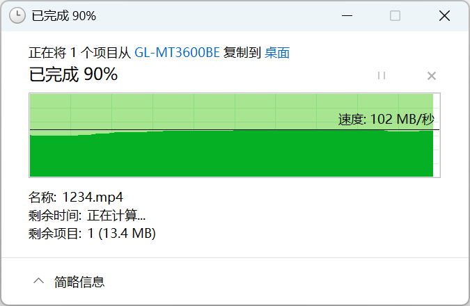 ▲使用ASUS PCE-BE90BT无线网卡,5G无线读取速度102MB/S。