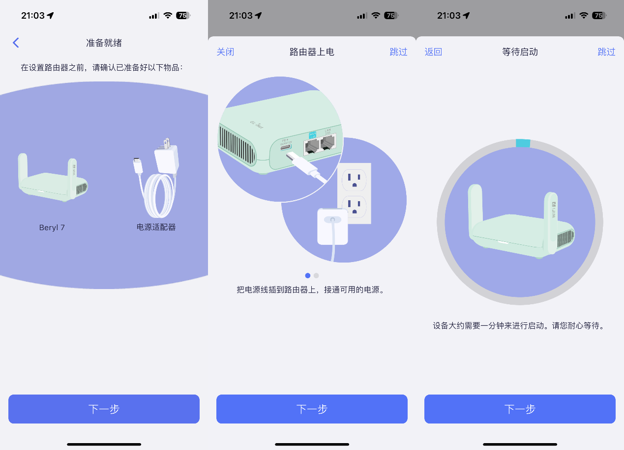▲根据APP提示连接电源适配器,并等待路由器启动,路由器需要约1分钟时间来进行初始化。