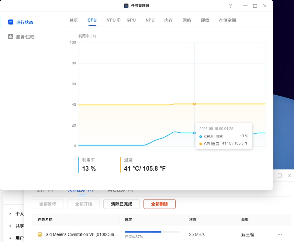 cpu最高占用13%,解压速度也起不来,可能是绿联的调度策略比较保守。