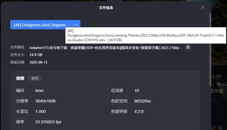 播放4K杜比双层电影,信息如上。