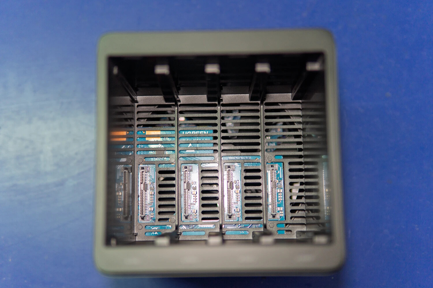 竖插硬盘托架,配备硅胶缓冲垫+弹臂减震,