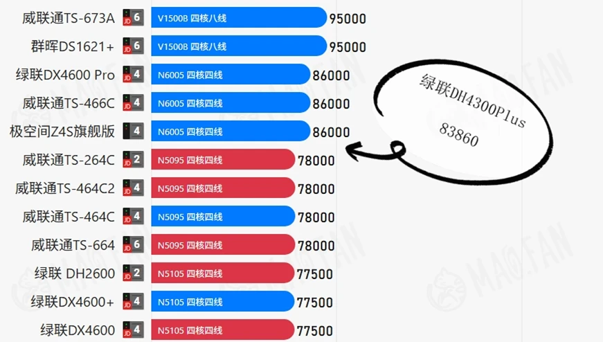 作为参考,其他的NAS跑分大致如下: