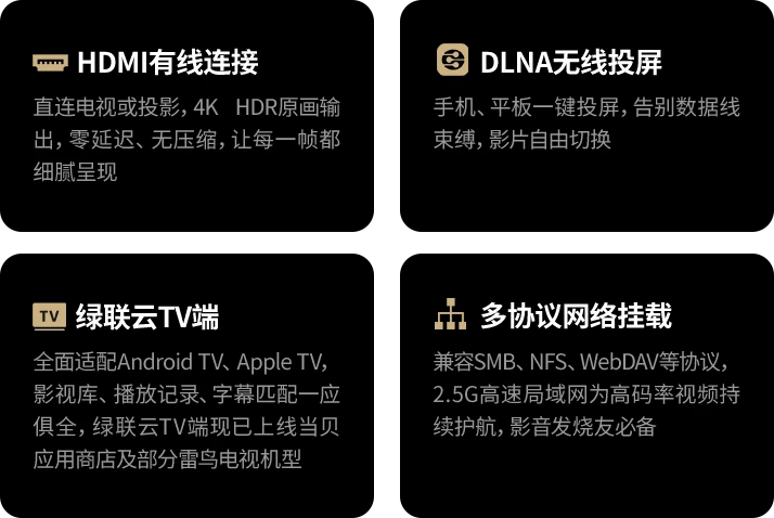电视可以使用绿联云TV端,也可以直接使用NAS上的HDMI直连电视,单独的媒体处理单元VPU,提升解码效率,打造无广告私人影院。