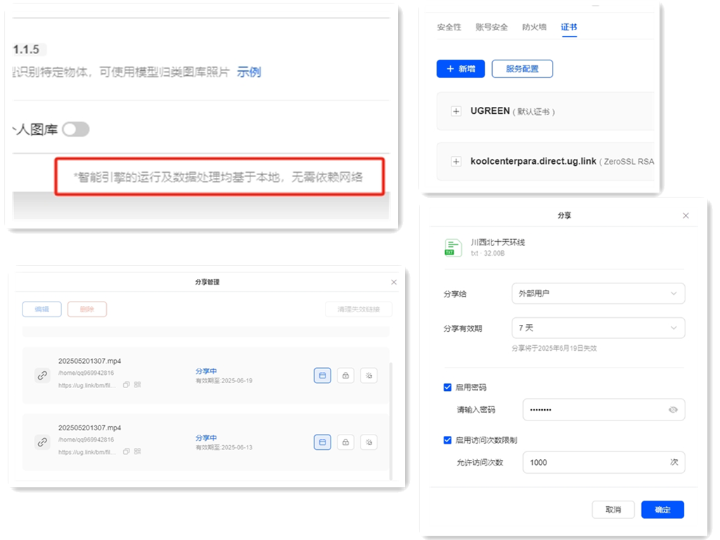 数据传输加密HTTPS协议:所有远程访问强制加密传输,防中间人攻击;UGREENlink穿透:内置企业级内网穿透技术,无需公网IP暴露设备。