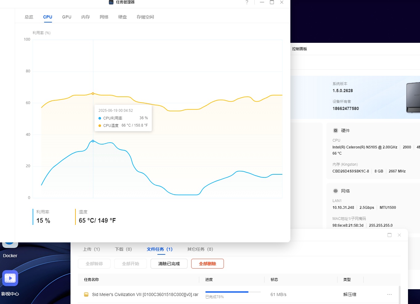 可以看到绿联DX4600的N5105自带的Intel UHD Graphics的利用率在0-40之间反复横跳。