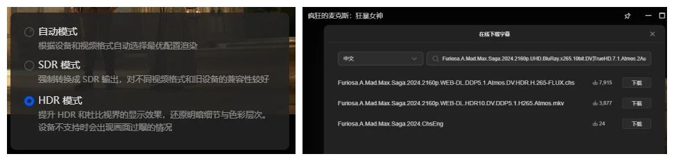 播放器可以手动选择色彩模式,也可以将HDR模式重映射成SDR,兼容不同的设备。