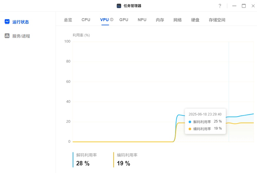 VPU解码率25%,编码率19%,曲线十分平稳。