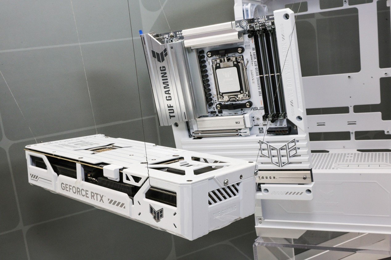 一旁还有TUF GAMING B850-BTF WIFI W背置主板,同样拥有背置接口设计和背置显卡供电插槽,隐藏和减少正面线材,提供更简洁、更高效的装机体验。主板拥有近乎全覆盖的银白散热装甲,连PCB也变为浅色,颜值达到新高度。高规格供电设计和全方位的散热解决方案,可尽情释放锐龙9000系列处理器的潜力。板载3个M.2接口,其中1个支持PCIe 5.0。拥有丰富的USB接口,包括USB 20Gbps Type-C接口以及前置USB Type-C接口,可同时外接多个设备。板载2.5G有线网卡,支持WiFi7,大幅提高网络传输速度。M.2快拆装甲、M.2便捷卡扣、以及易拆式天线都具备,贴心设计让你尽享DIY乐趣。