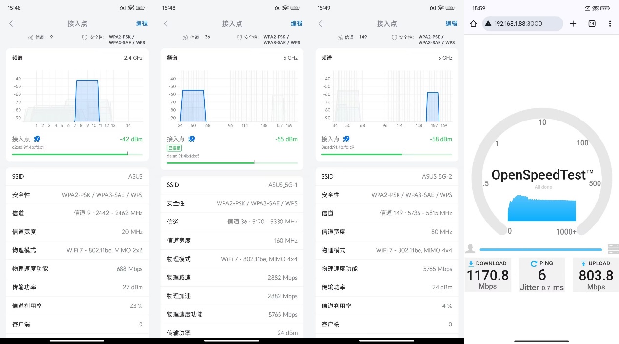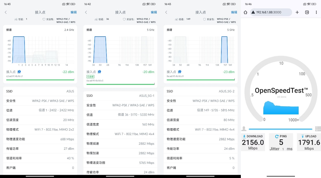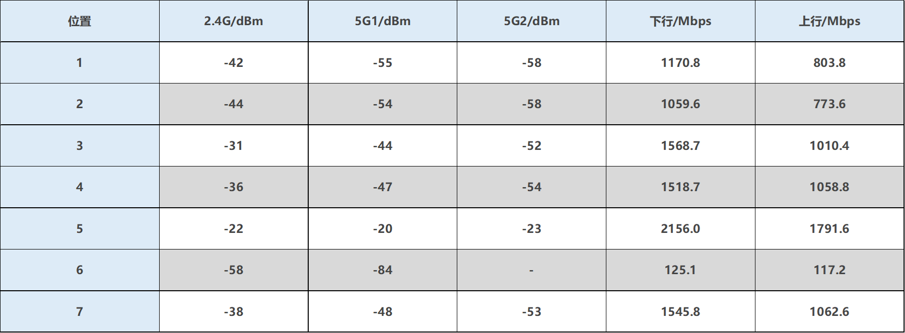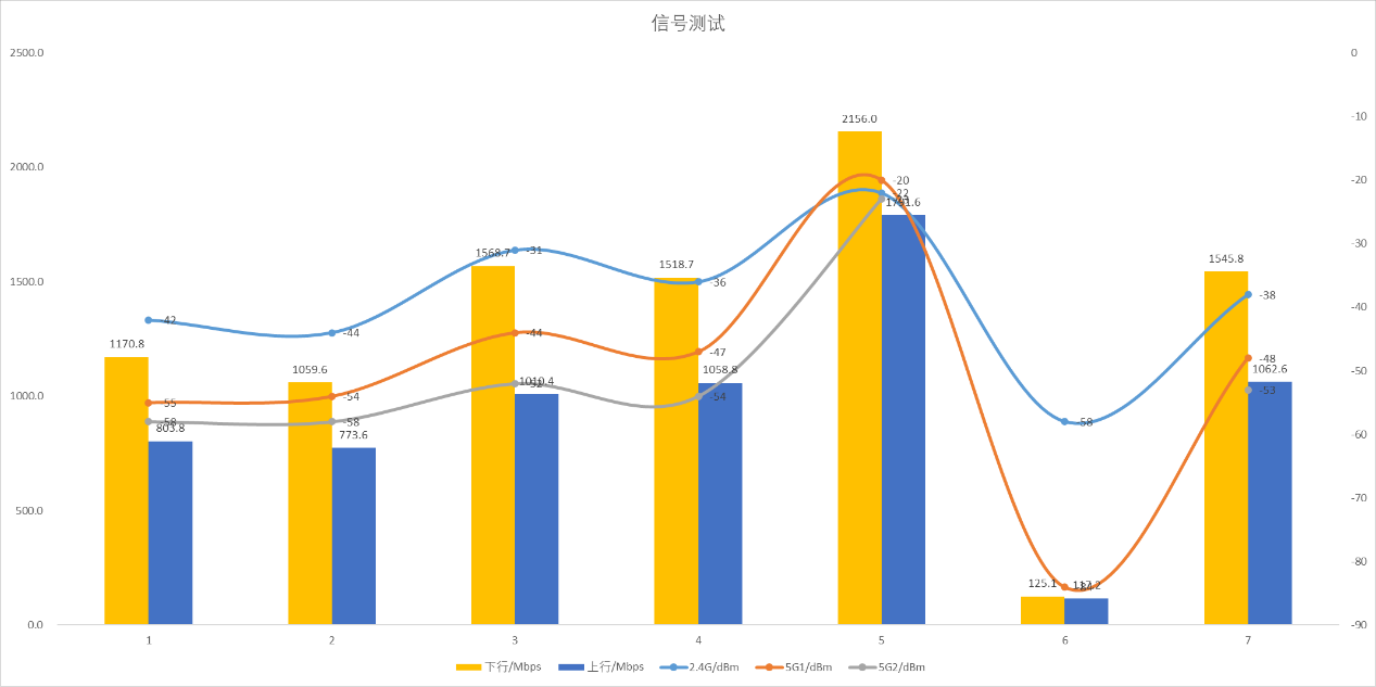 ▲华硕ROG魔盒Pro无线地区选择澳大利亚后,2.4G信号发射强度为27dBm,5G1和5G2信号发射强度都为24dBm。 ▲1号位置处2.4G、5G1、5G2信号强度以及Speedtest测试。 ▲2号位置处2.4G、5G1、5G2信号强度以及Speedtest测试。 ▲3号位置处2.4G、5G1、5G2信号强度以及Speedtest测试。 ▲4号位置处2.4G、5G1、5G2信号强度以及Speedtest测试。 ▲5号位置处2.4G、5G1、5G2信号强度以及Speedtest测试。 ▲6号位置处2.4G、5G1、5G2信号强度以及Speedtest测试。 ▲7号位置处2.4G、5G1、5G2信号强度以及Speedtest测试。 ▲数据汇总。- 除位置6外,其他位置均实现了千兆级网络传输。