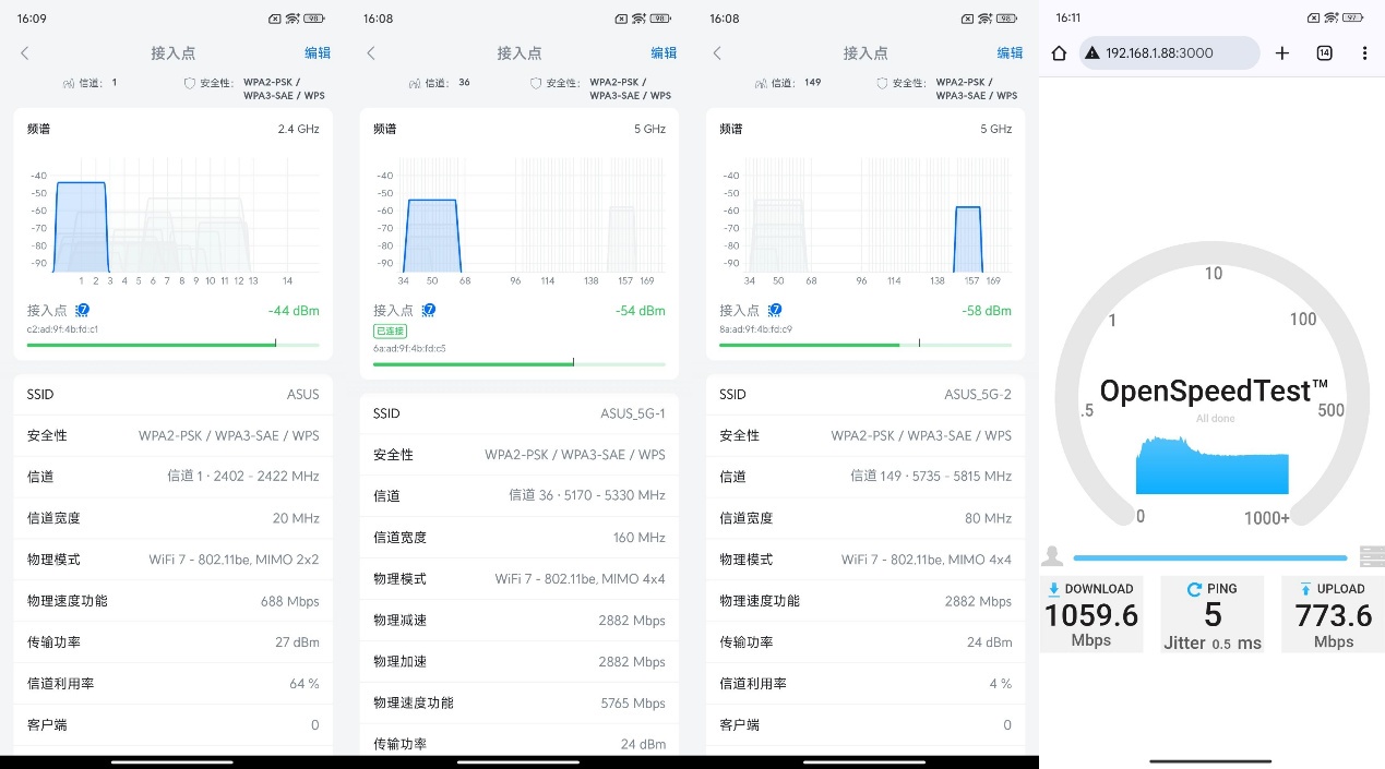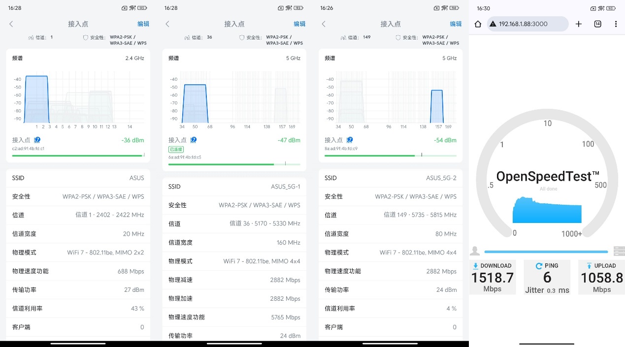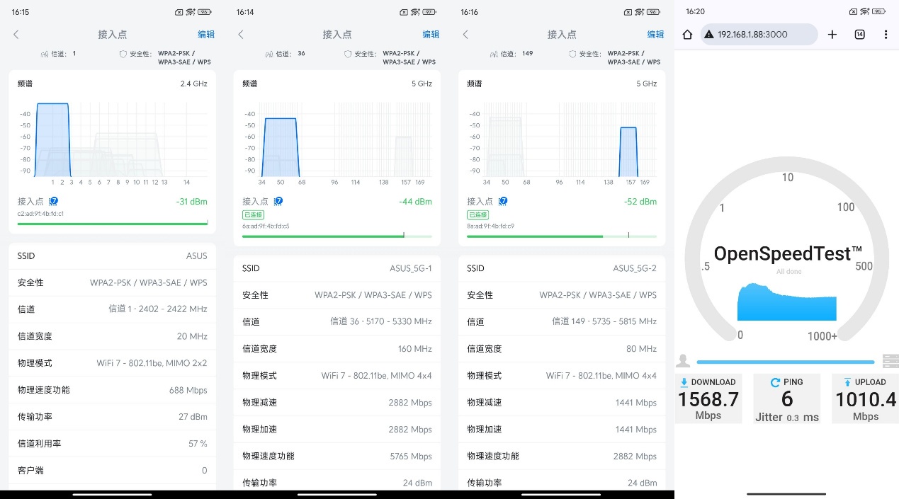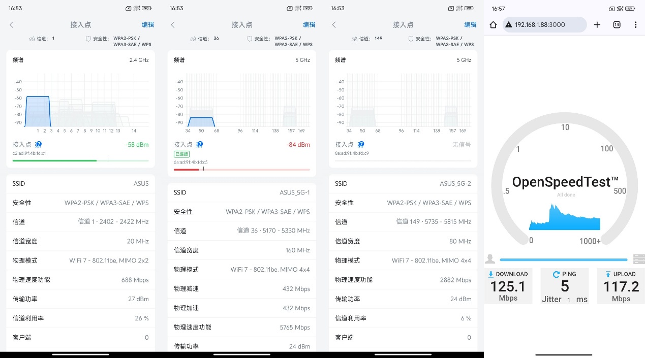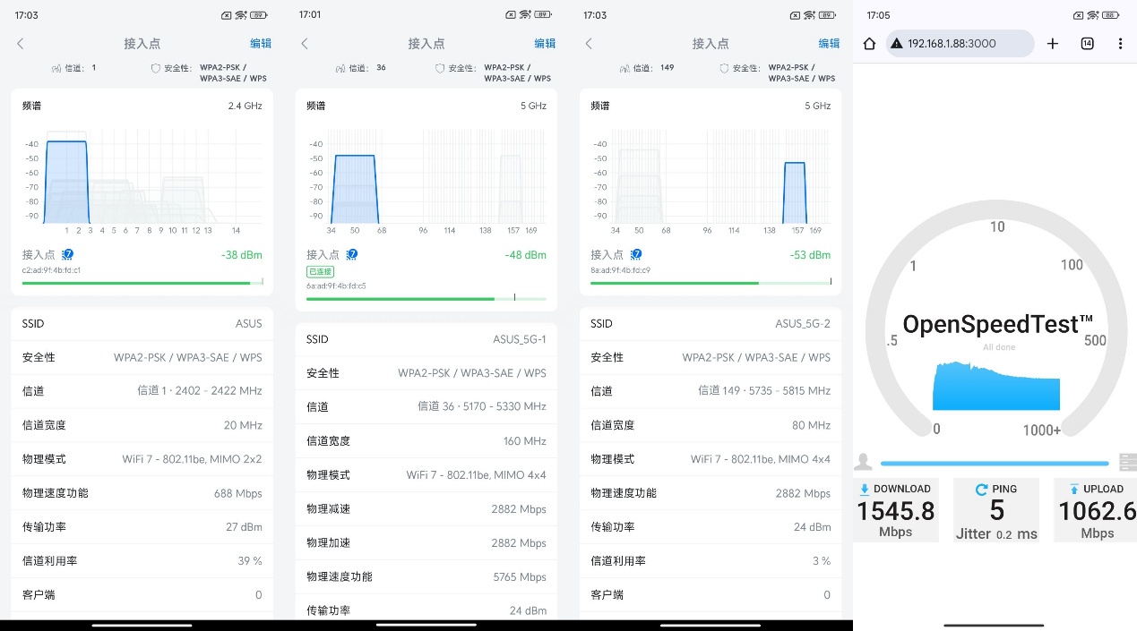 ▲华硕ROG魔盒Pro无线地区选择澳大利亚后,2.4G信号发射强度为27dBm,5G1和5G2信号发射强度都为24dBm。 ▲1号位置处2.4G、5G1、5G2信号强度以及Speedtest测试。 ▲2号位置处2.4G、5G1、5G2信号强度以及Speedtest测试。 ▲3号位置处2.4G、5G1、5G2信号强度以及Speedtest测试。 ▲4号位置处2.4G、5G1、5G2信号强度以及Speedtest测试。 ▲5号位置处2.4G、5G1、5G2信号强度以及Speedtest测试。 ▲6号位置处2.4G、5G1、5G2信号强度以及Speedtest测试。 ▲7号位置处2.4G、5G1、5G2信号强度以及Speedtest测试。 ▲数据汇总。- 除位置6外,其他位置均实现了千兆级网络传输。