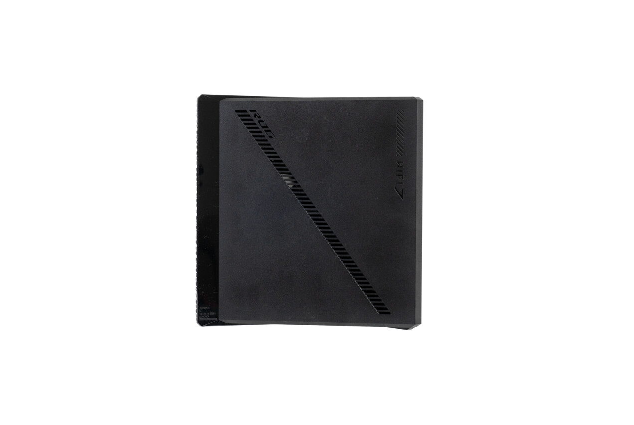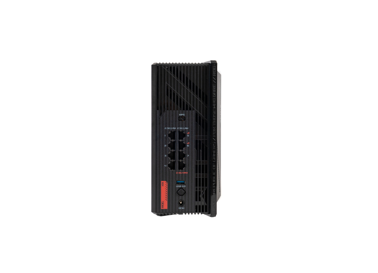 ▲ROG魔盒Pro外包装以黑红为主色调,完美融合电竞美学与极简风格。左侧烫金工艺的字样在哑光黑底上熠熠生辉,右侧立体浮雕工艺的路由器本体透出凌厉电竞气质,具有强烈的视觉引导力。 ▲正面的 ROG Logo采用独特炫彩膜工艺,即便不通电,也能凭借立体结构与光影折射,投射出绚丽的色彩,在静态中延续ROG家族的红色基因。 ▲在细节方面,机身右侧的ROG LOGO透光孔既强化品牌辨识度,又为整体设计注入未来科技感;左侧醒目的WiFi7标识则代表其对最新无线协议的支持,为用户开启次世代网络体验。 ▲赛博朋克风格的几何切割机身设计,使得这款路由器在外观上独树一帜。顶部通风孔暗藏 ROG Logo,与底部悬浮支架构建成立体风道,把电竞美学和实用散热精妙融合,保障路由器长时间运行也能性能稳定。 ▲背部接口矩阵设计实用且专业。8个2.5G端口,1 - 7口为 LAN 口、8口为 WAN 口,聚合有线容量达20G;双2.5GbE电竞专属端口(LAN5/LAN6),可智能识别游戏数据包并触发Turbo加速,为电竞场景定制高速通道;USB3.2 Gen1接口支持 NTFS/exFAT双格式外接存储,拓展灵活;专属WPS实体按钮,长按3秒就能激活安全配对模式,细节设计尽显专业考量。 ▲随机附赠的ROG编织6类屏蔽网线,不仅长度适中,而且质量上乘,为用户提供了可靠的有线连接选择。 ▲电源输出规格为12V 5A,60W的输出功率,确保了路由器的稳定运行。固件