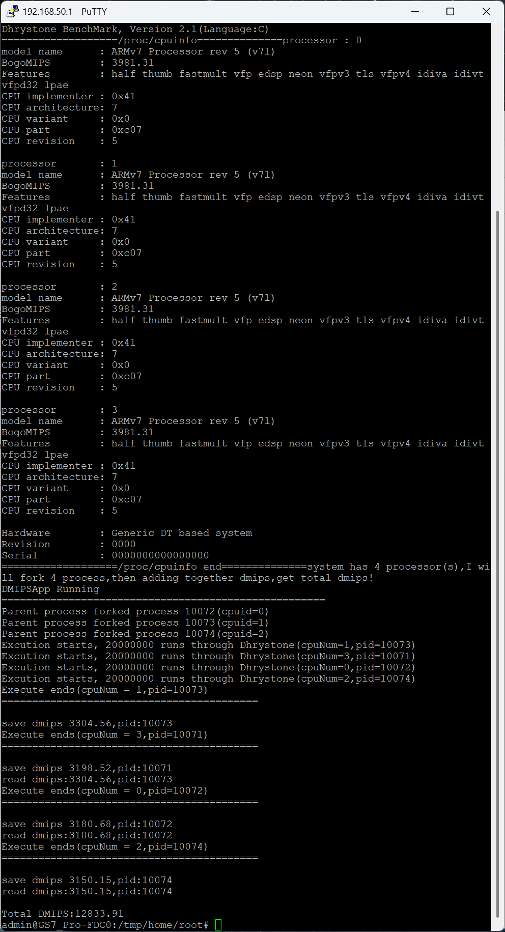 - 在 dhrystone 测试中,获得了 12833.91的得分,CPU在整数运算和一般处理任务方面具有强大的性能,能够快速执行指令和处理数据,为路由器的多任务运行提供有力支持。