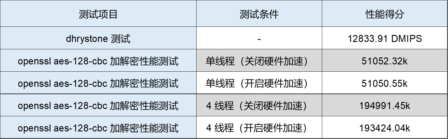 ▲dhrystone测试,DMIPS分数在12833.91。 ▲openssl aes-128-cbc加解密性能,单线程测试(关闭硬件加速)得分为51052.32k。 ▲openssl aes-128-cbc加解密性能,单线程测试(开启硬件加速)得分为51050.55k。 ▲openssl aes-128-cbc加解密性能,4线程测试(关闭硬件加速)得分为194991.45k。 ▲openssl aes-128-cbc加解密性能,4线程测试(开启硬件加速)得分为193424.04k。DMIPS性能: