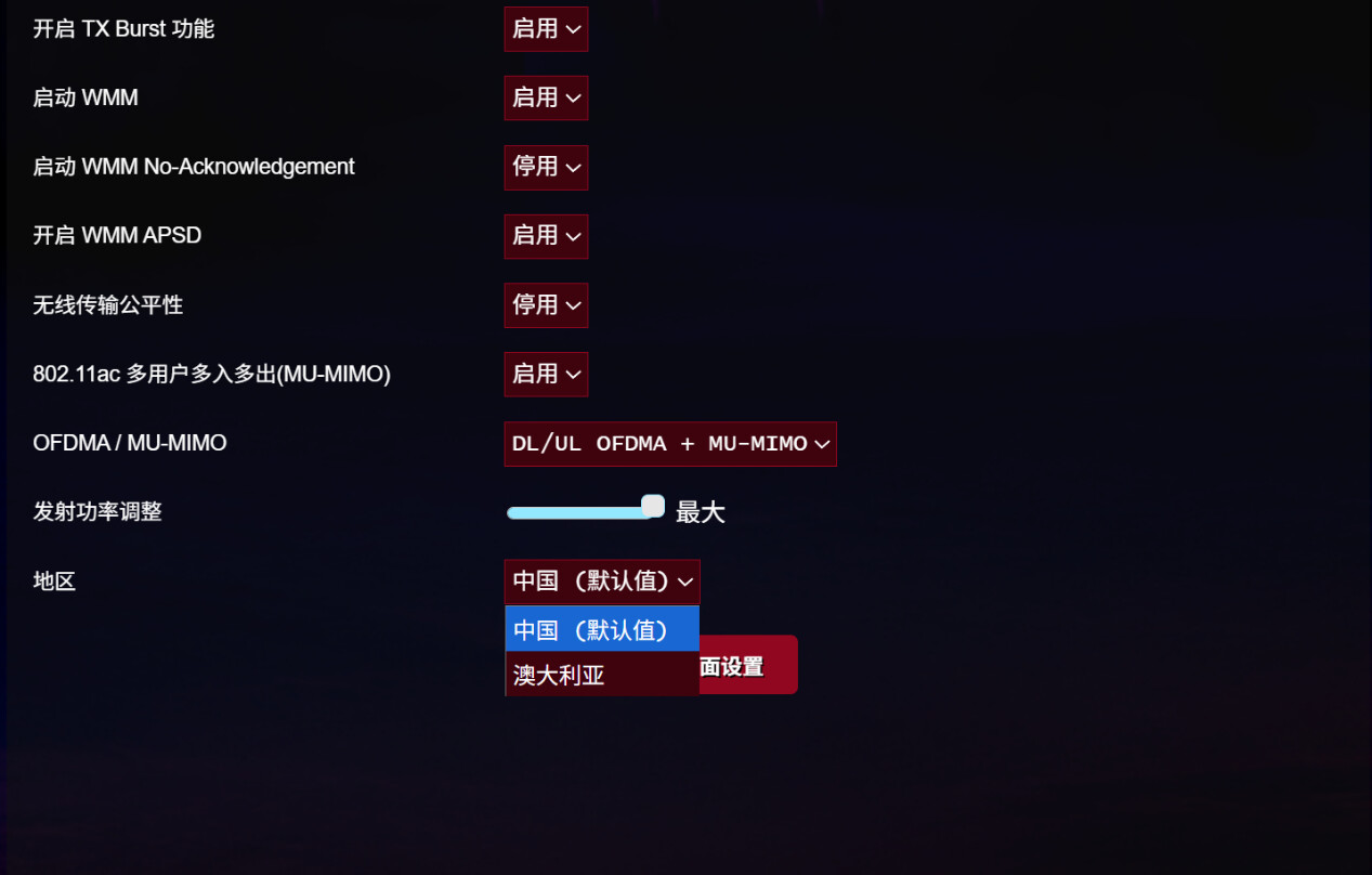 - 地区:不同地区对无线设备的发射功率、工作信道等有监管、法规相关要求。 当前选择为中国,默认值。下方还有一个选项是“澳大利亚”,提示用户可以通过切换无线地区来增强无线发射功率,澳大利亚的无线发射功率最强。