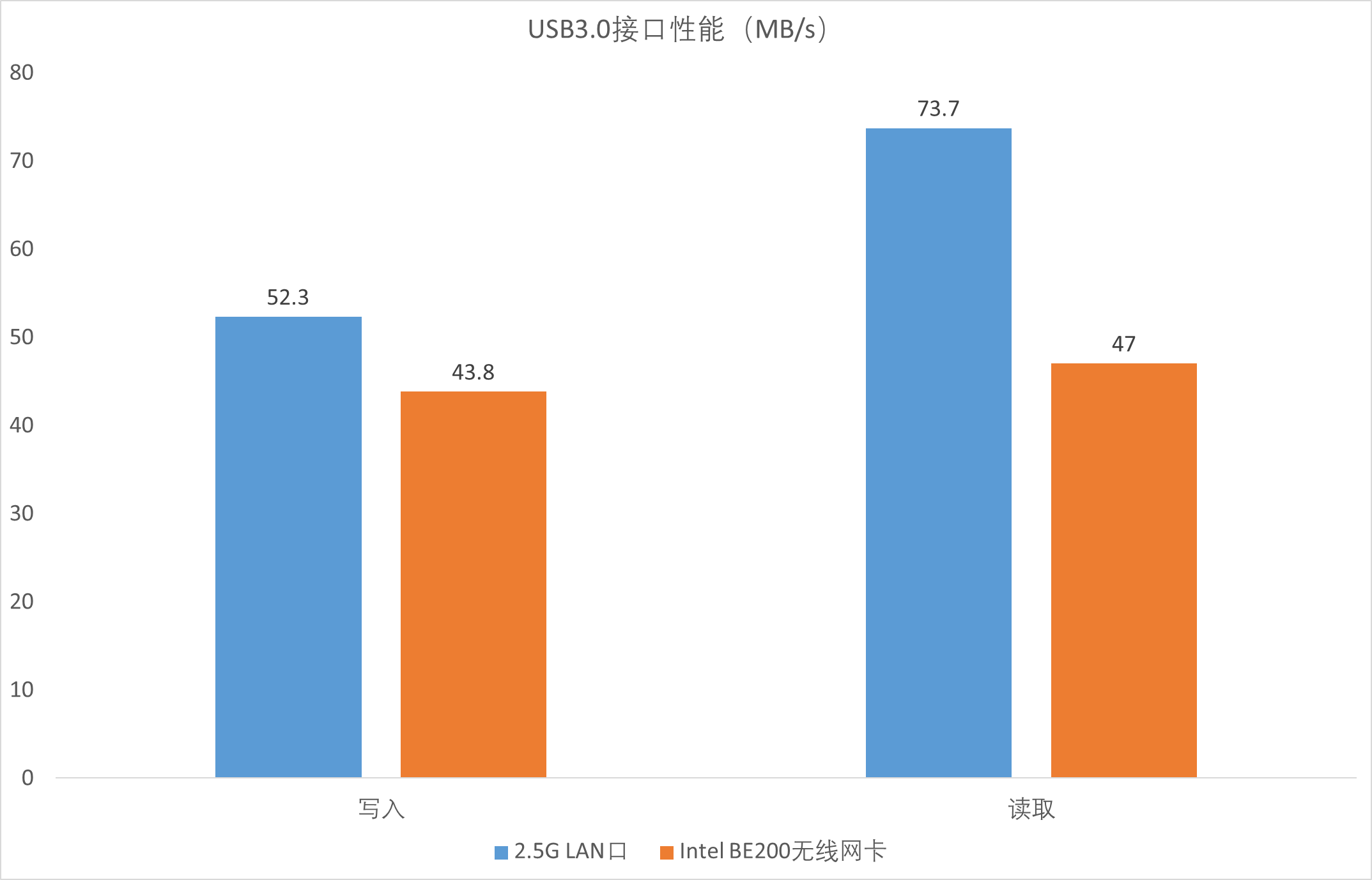 ▲2.5G LAN口有线写入速度52.3MB/S。 ▲2.5G LAN口有线读取速度73.7MB/S。 ▲使用Intel BE200无线网卡,5G无线写入速度43.8MB/S。 ▲使用Intel BE200无线网卡,5G无线读取速度47.0MB/S。- 有线读取速度较快:通过2.5G LAN口进行有线读取时,速度达到 73.7MB/S ,这一速度在数据传输中能有效缩短读取时间,对于需要频繁从外接存储设备读取数据的场景,如传输大型文件、备份数据等,能提升操作效率。