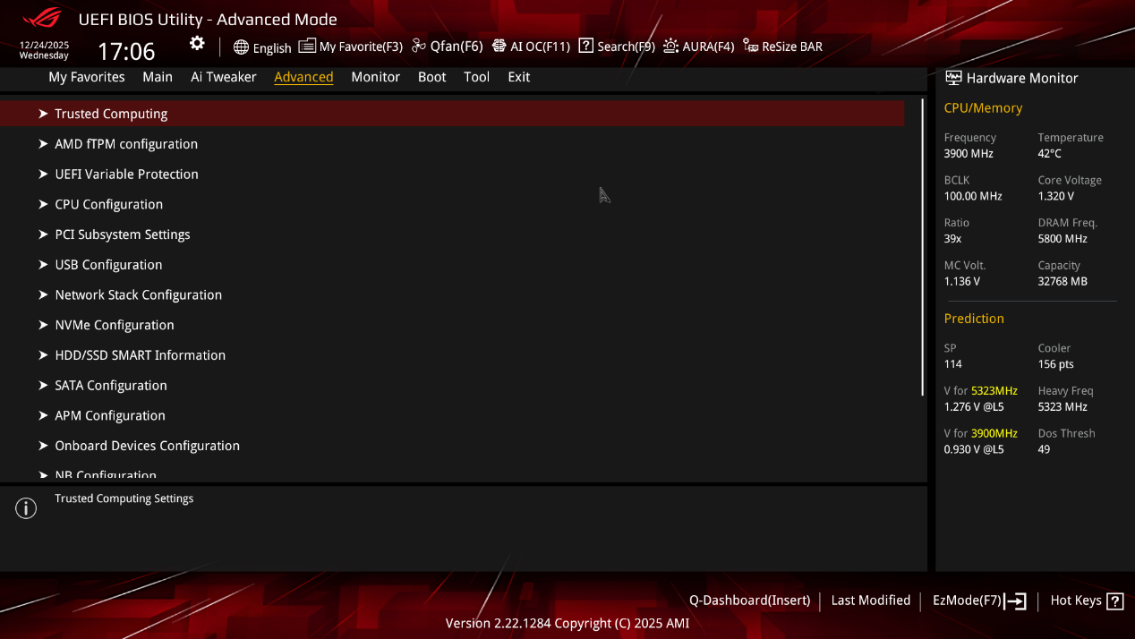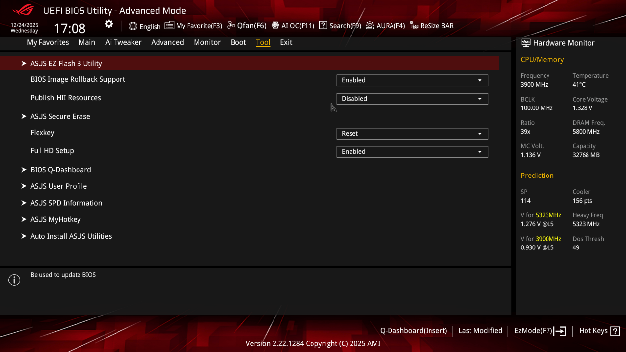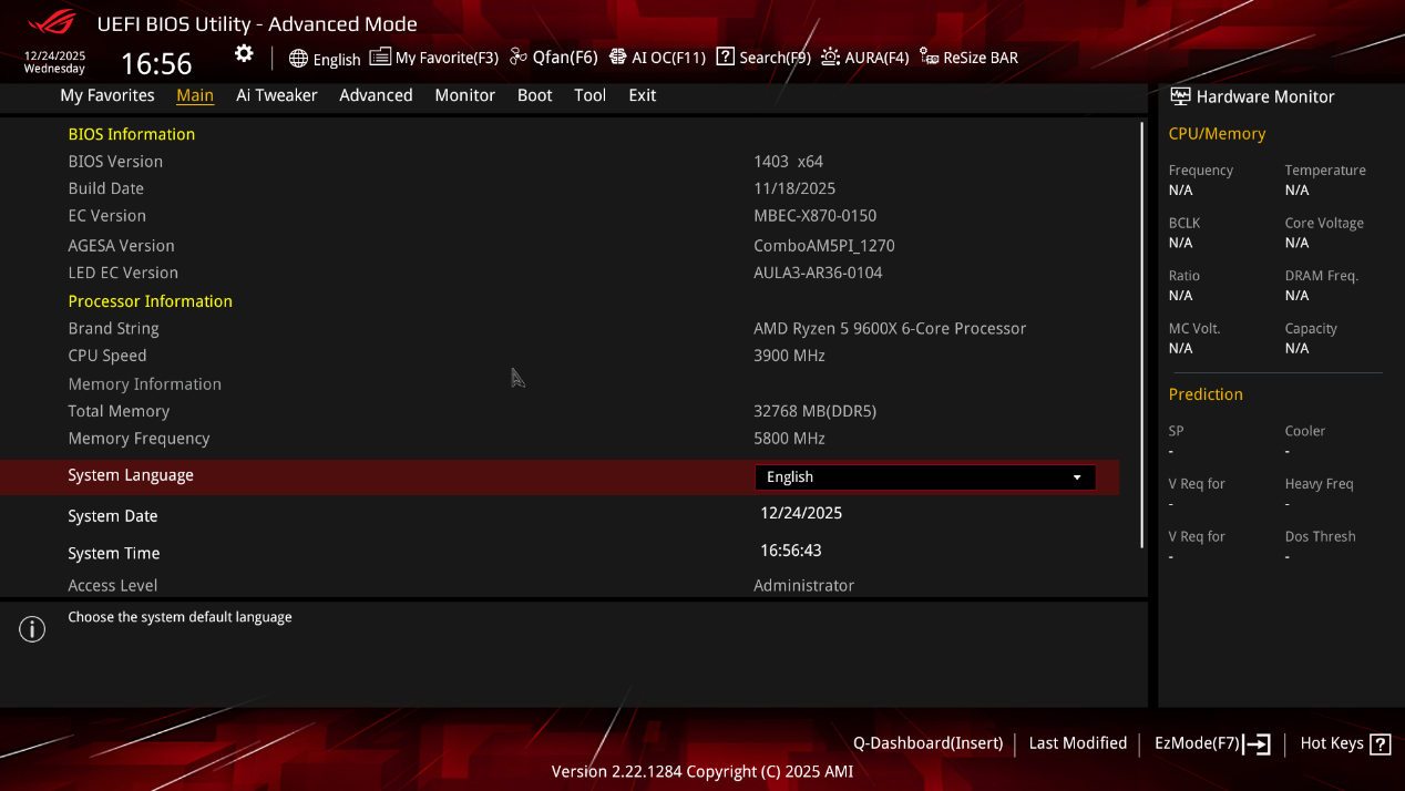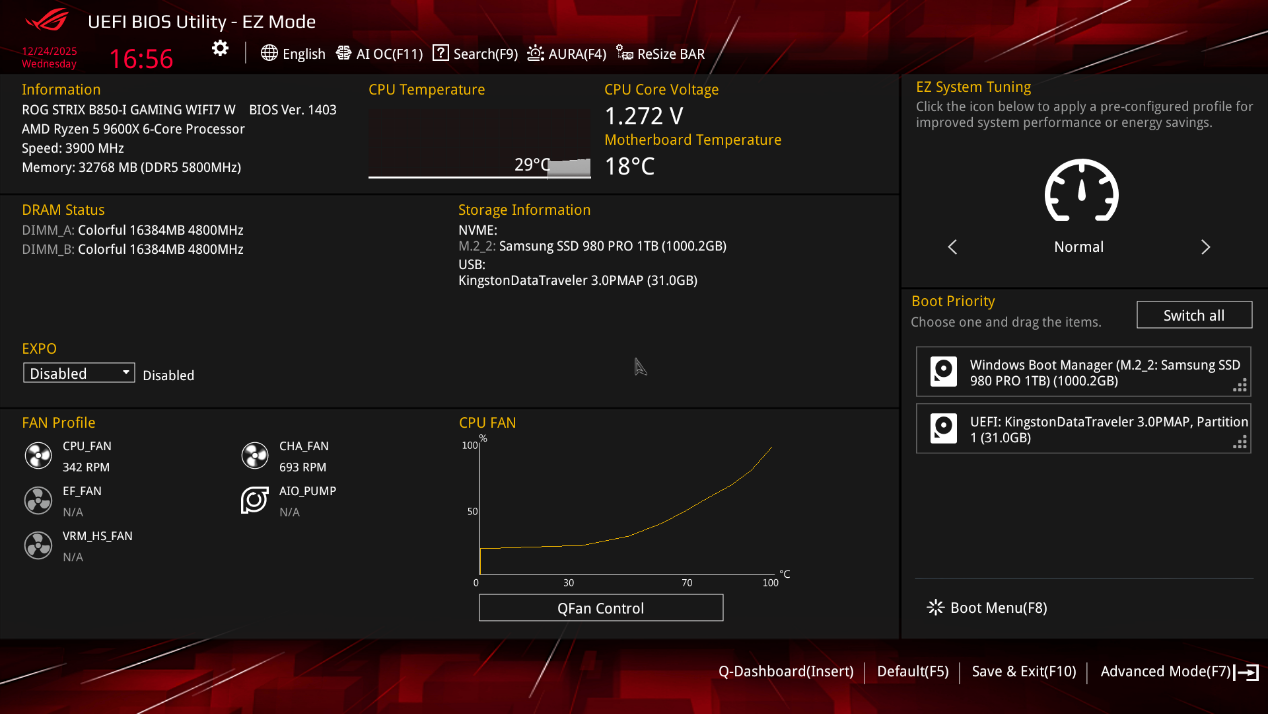 ▲吹雪ROG Strix B850-I Gaming WiFi 7 W的 UEFI BIOS EZ 模式界面。这个界面为用户提供全面的系统监控和基本的硬件调优功能,适合希望对系统进行简单优化但又不想深入复杂设置的用户。通过这个界面,用户可以快速查看硬件状态、调整风扇转速、设置启动顺序等。