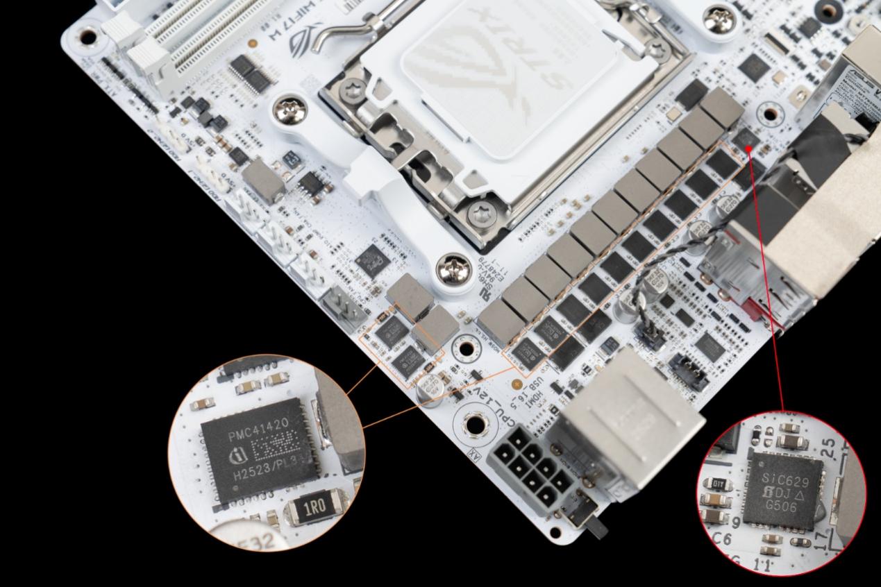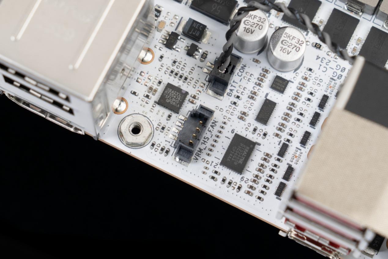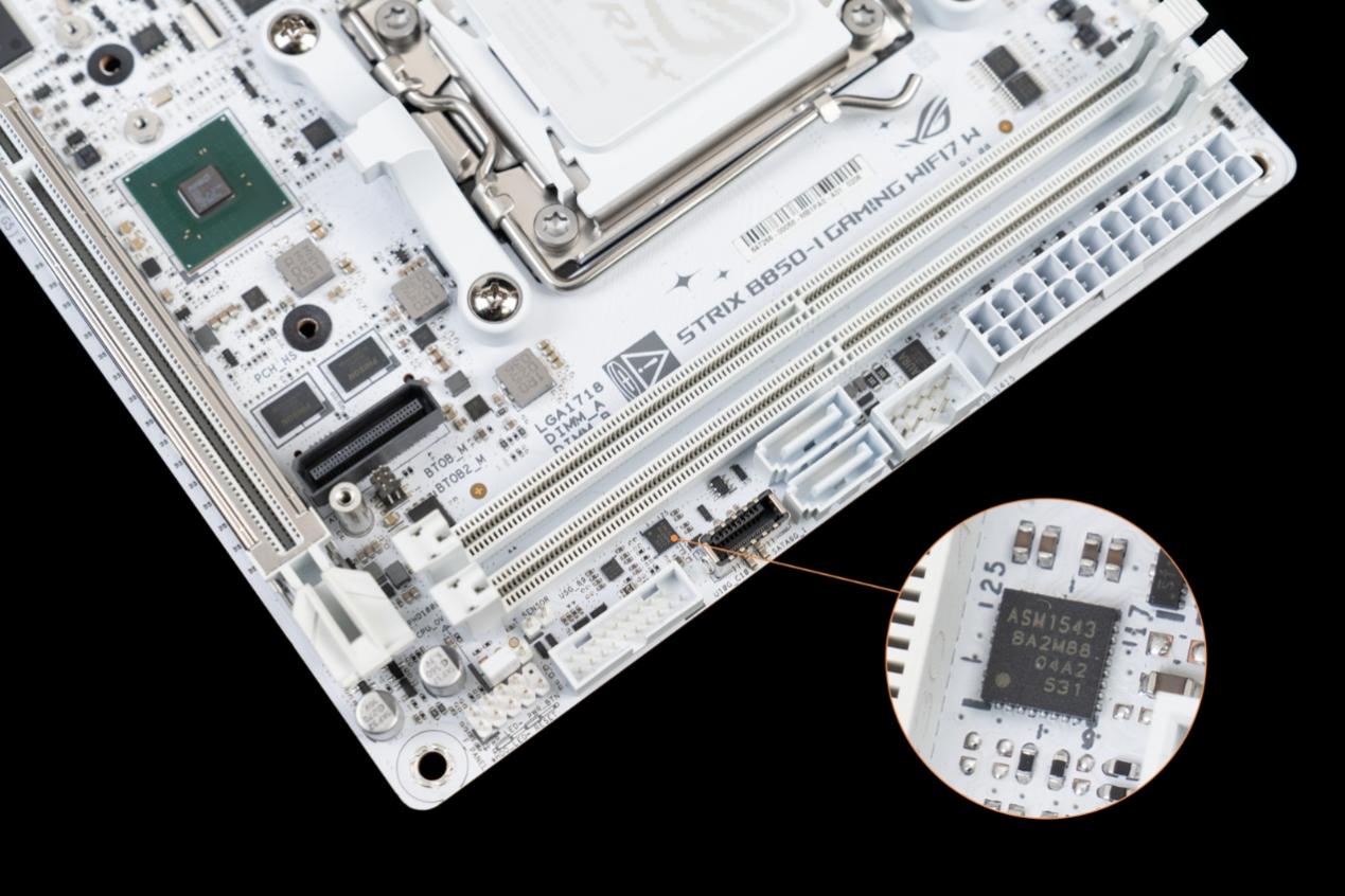 ▲在ITX有限的布局空间里,背面增设 M.2 插槽是极具实用性的设计,ROG B850迷你吹雪的两个M.2插槽均支持PCIe5.0,满足玩家同时搭载系统盘、游戏盘的高速存储需求,最大化挖掘了迷你版型的空间潜力。