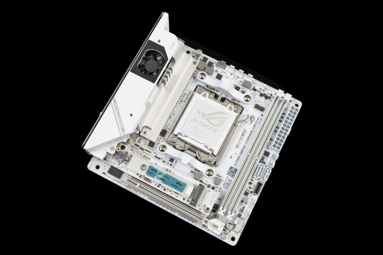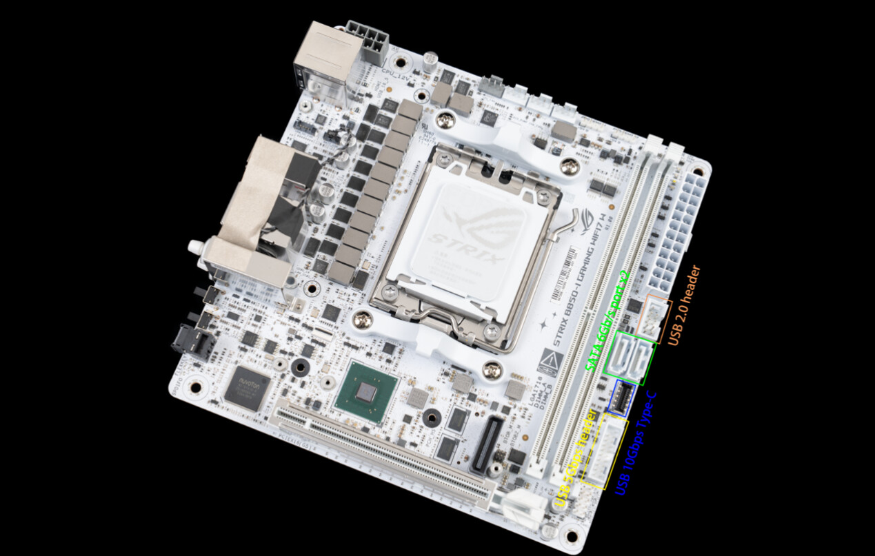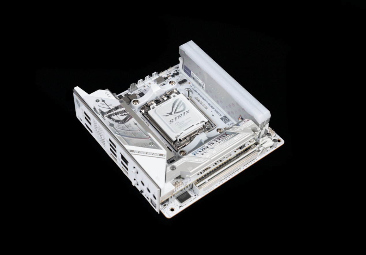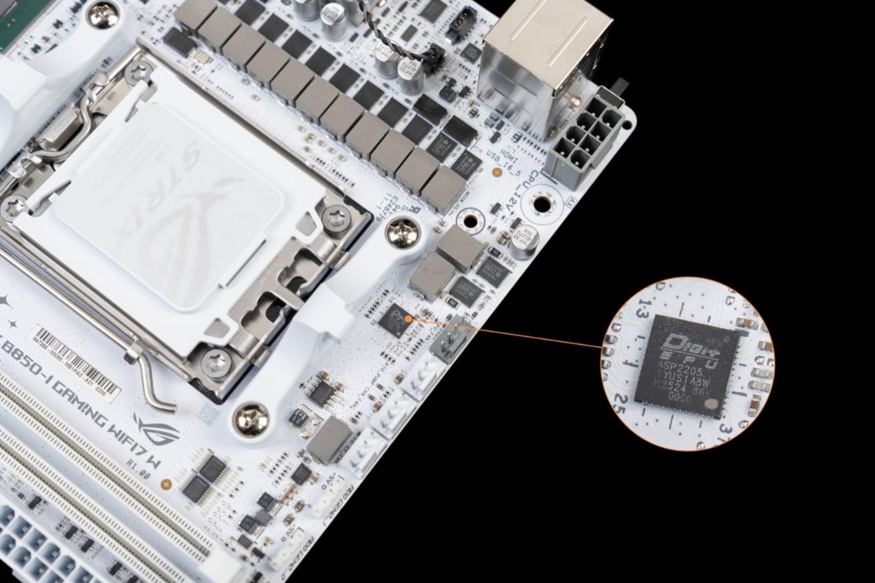 ▲作为吹雪ROG Strix系列的迷你款产品,ROG Strix B850-I Gaming WiFi 7 W延续了吹雪家族式的电竞设计语言,白色PCB搭配银色金属散热模块,兼顾质感与辨识度。尽管版型仅为17×17cm的标准ITX规格,但核心配置却毫不缩水,堪称“小身材大容量”的典型代表。
