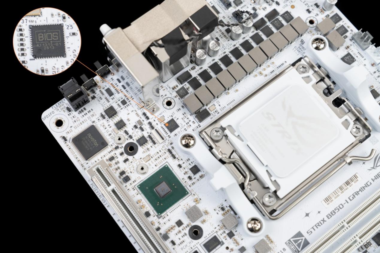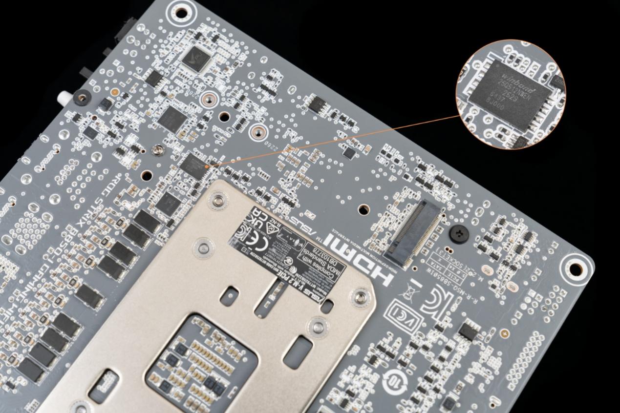 ▲25Q512NWEN 的芯片,是Winbond(华邦电子)公司生产的512Mbit(64MB)Serial NOR Flash存储芯片,用于主板上的BIOS/UEFI固件存储。64MB的大容量有利于下代硬件的固件更新,同时也能容纳更丰富的 BIOS功能模块。
