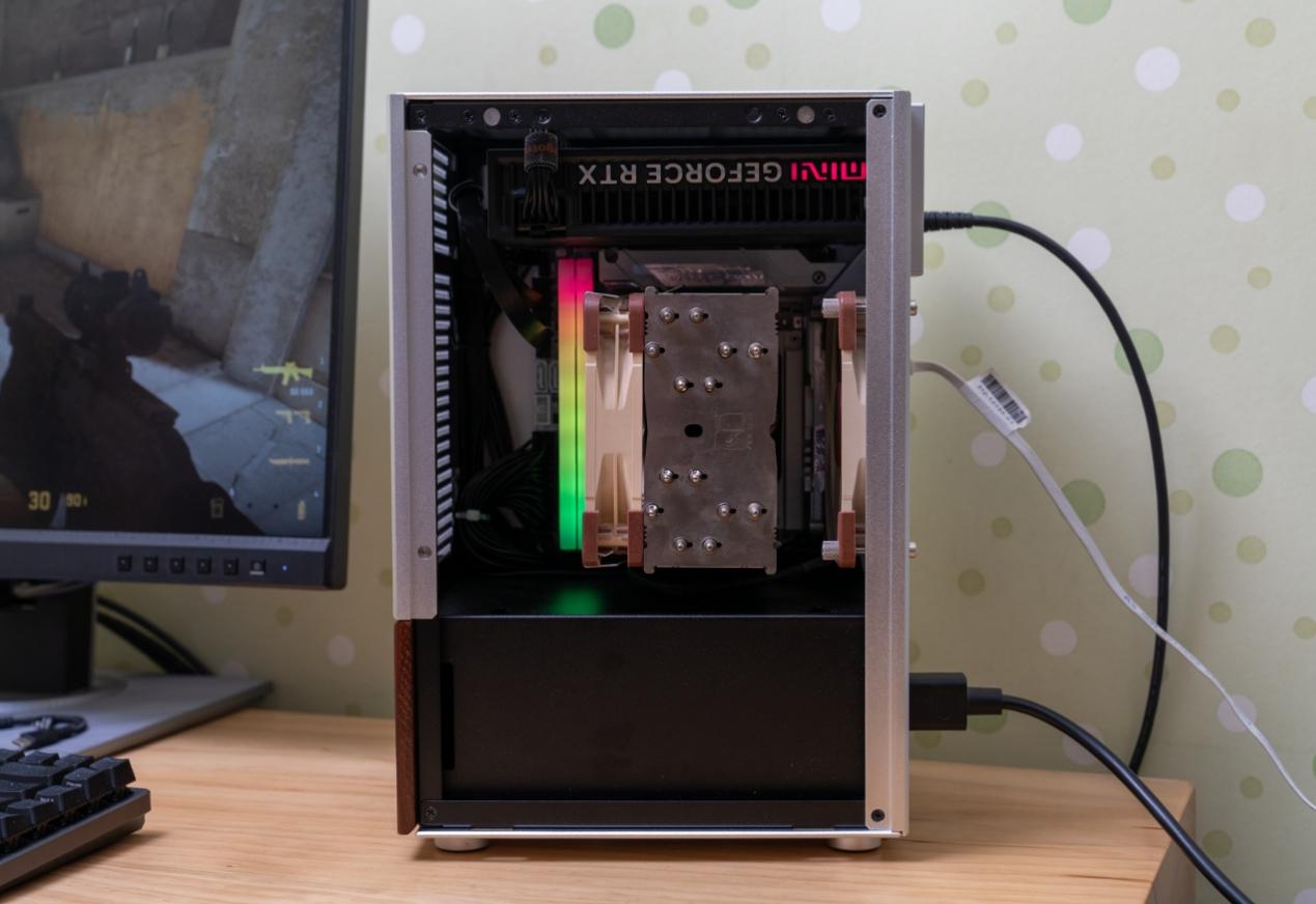 ▲显卡被安装在机箱顶端位置,恰好能直接从机箱外侧吸入冷空气。这一布局让显卡风扇无需依赖机箱内部风道,就能获取外界低温气流,在ITX机箱的封闭环境下,也能有效避免积热问题。