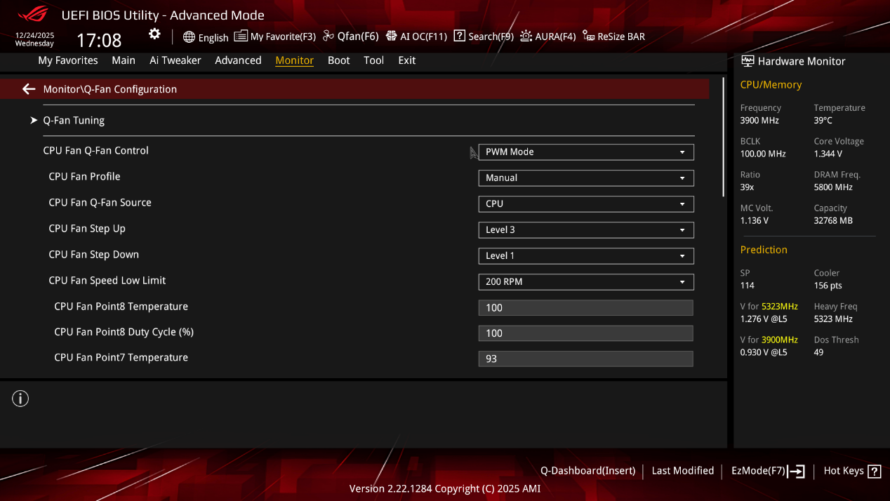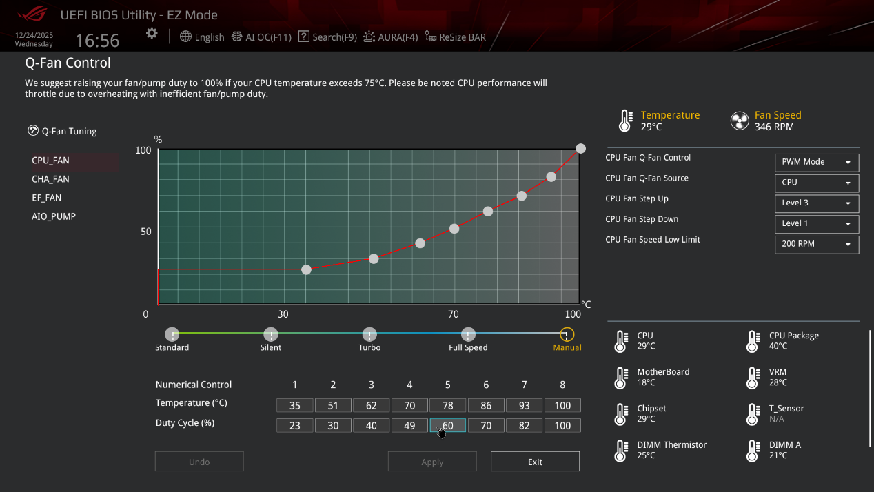 ▲QFan Control页面,用户可以对CPU风扇、机箱风扇(CHA_FAN)以及AIO泵的转速曲线进行自定义设置,同时支持切换不同的调速模式(标准、静音、涡轮、全速、手动),还可以设置风扇延迟启动和降速策略,兼顾性能与静音体验。