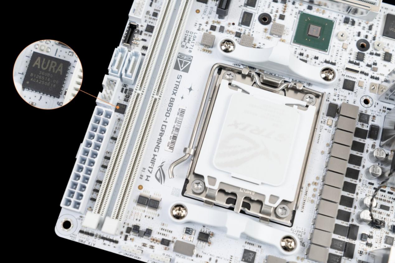 ▲华硕AURA芯片,负责统一管理主板上的 RGB 灯效组件,并支持与显卡、内存、机箱风扇等外设的aura sync灯效同步,实现 “一键联动” 的沉浸式光效体验。