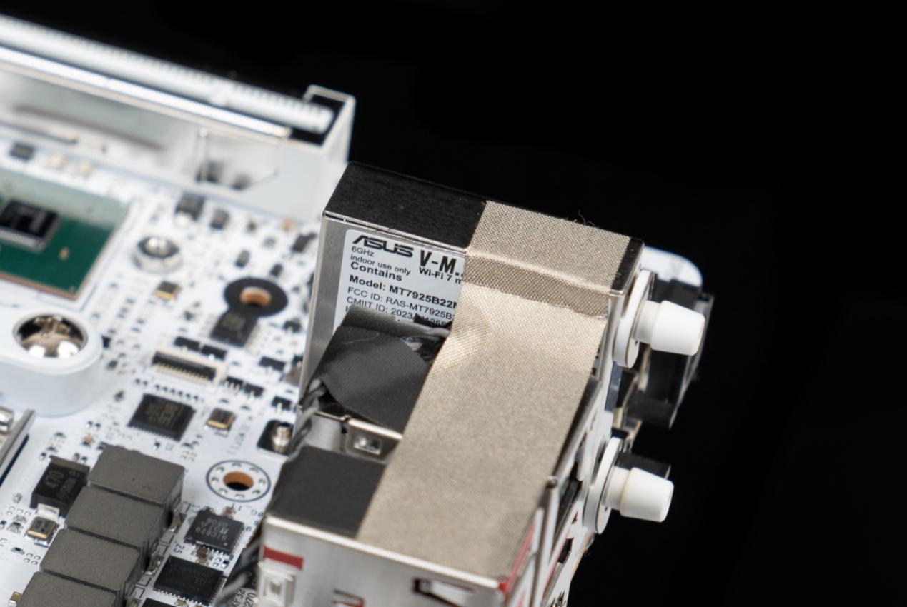 ▲ROG B850迷你吹雪搭载了易拆式天线接口,无需额外工具,轻轻按压卡扣即可快速插拔天线,相比传统螺纹接口,大幅降低了操作难度。即便是某些IO接口内凹的ITX机箱,也能快速安装。