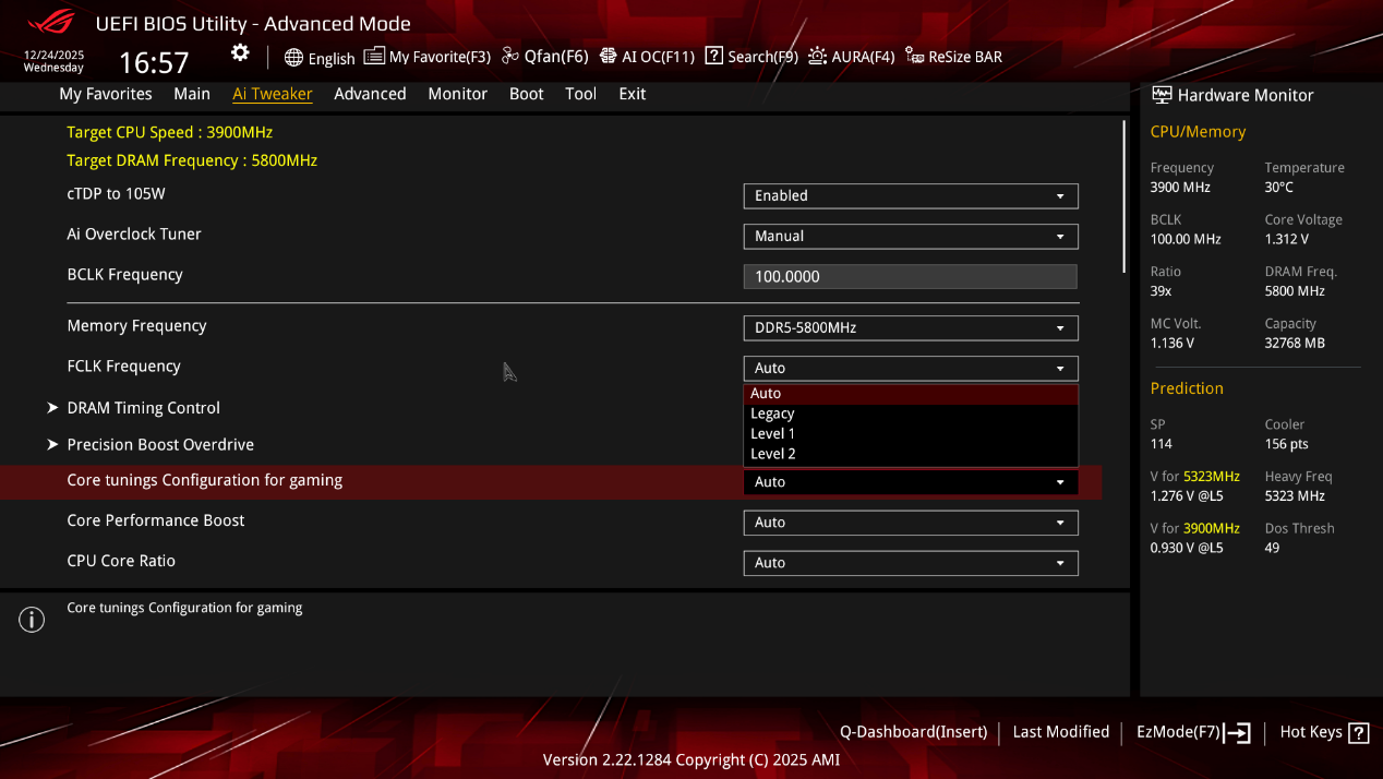 ▲开启Core tunings Configuration for gaming可以降低内存延迟。此外,该功能还提供了不同的配置选项(如Legacy、Level1、Level2),用户可以根据自身需求选择合适的配置等级以实现性能与稳定性的平衡。对于追求极致游戏性能的用户,可以将其设置为Level2,以获得最大的性能提升。