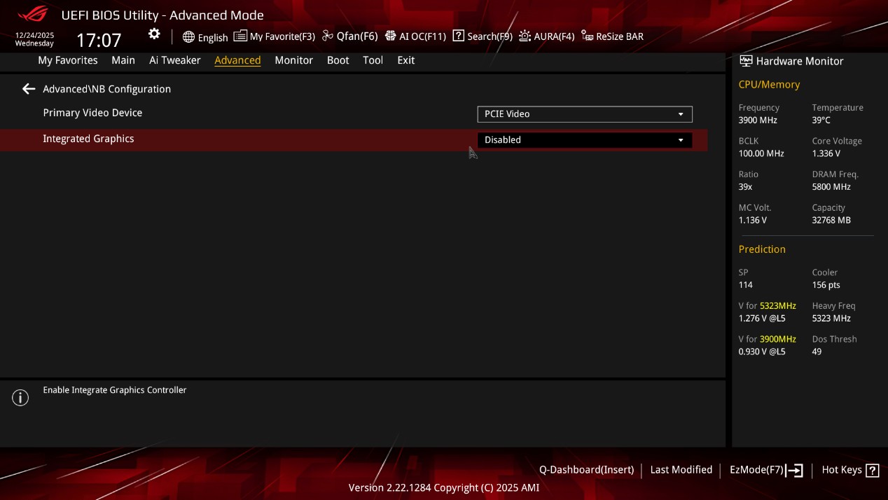 ▲NB Configuration菜单中,用户可以对显卡和核显的相关设置进行调整,例如选择主显示设备是独立显卡还是核显,启用或关闭核显,以及设置核显共享显存大小等。