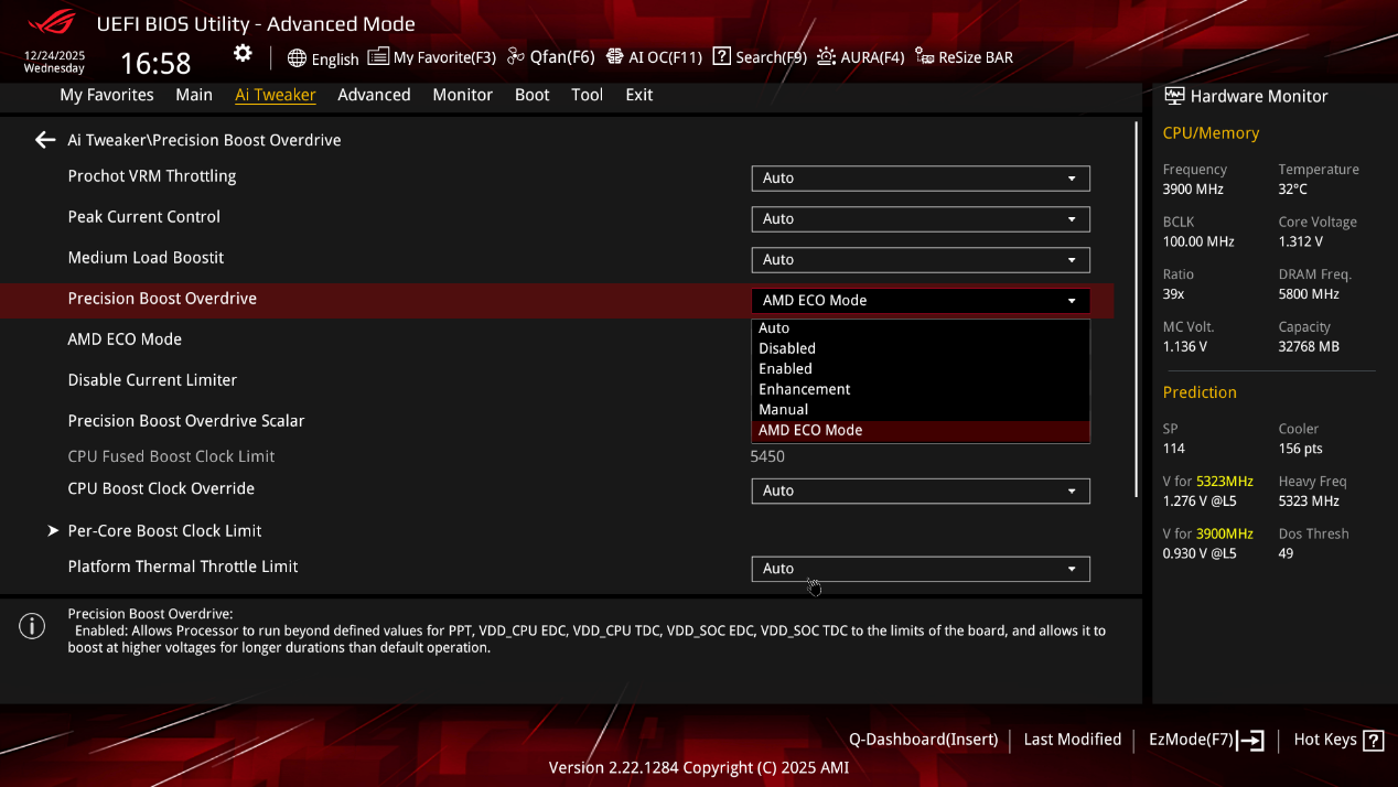 ▲Precision Boost Overdrive(PBO)页面,在这里可以对 CPU 的自动超频相关参数进行细致调节。将 Precision Boost Overdrive 设置为 Enhancement 可以进一步突破 CPU 默认的性能限制,让 CPU 在更宽泛的电压和功耗范围内实现更高的频率提升,从而为系统带来更强劲的性能释放。