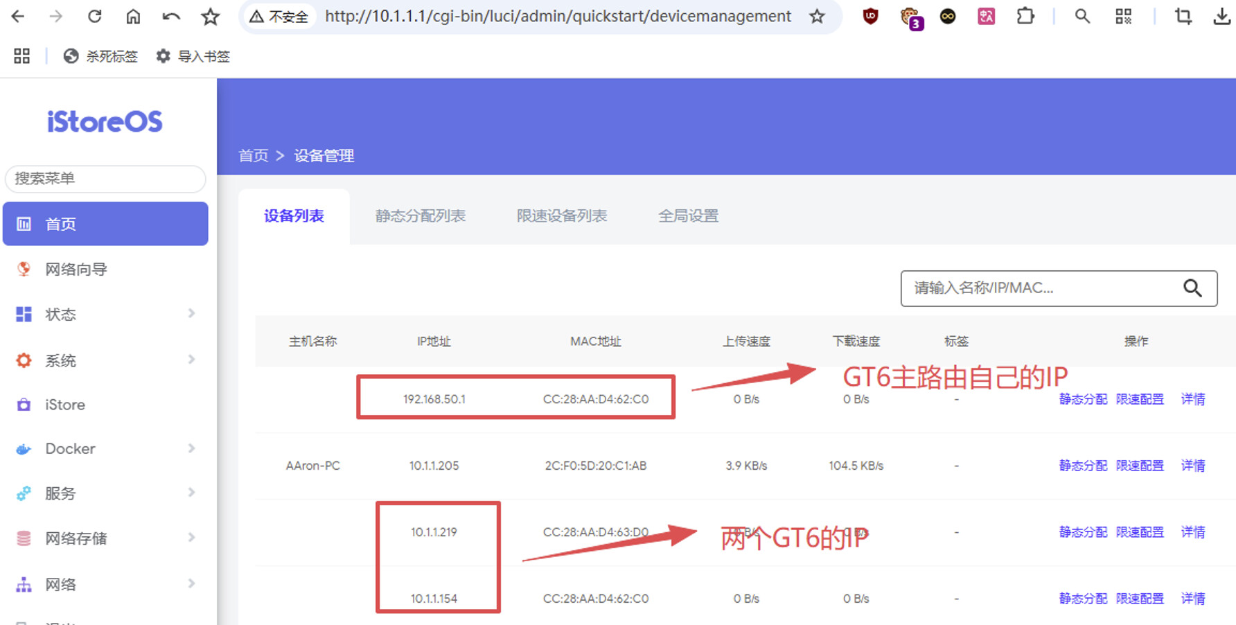 由iStoreOS 分配到GT的ip为10.1.1.219(子路由)10.1.1.154(主路由)192.168.50.1(GT6主路由的默认IP)