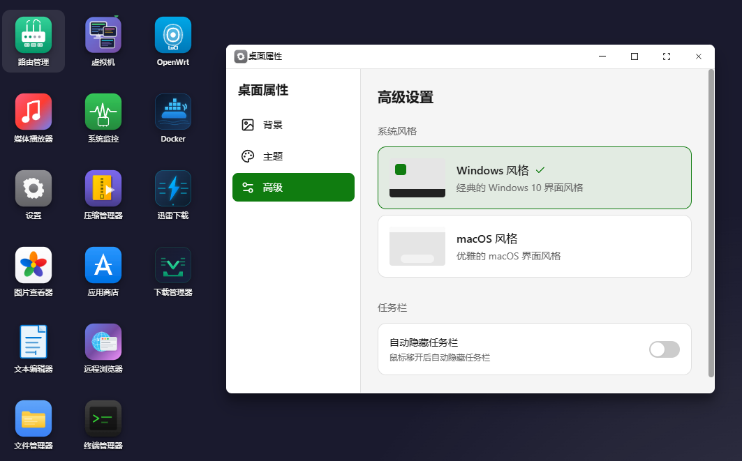 可以选Windows风,也可以切Mac风(任务栏、风格随便挑)。