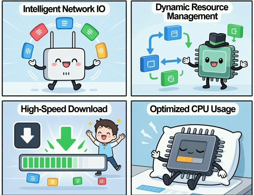 网络IO和磁盘IO智能调度,网络忙的时候限一限下载,网络空闲就放开吃资源;CPU占用也大幅优化。