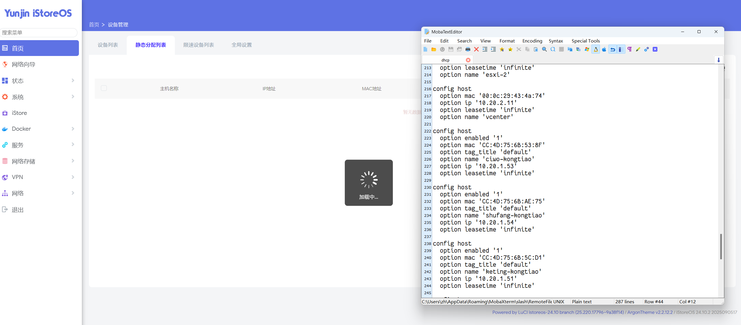 升级到20250905-24.10.2版本后,设备管理里支持将网关指定为默认网关或其他地址,但是在从设备列表切换到静态分配列表时会无限转圈没办法显示内容。我自己看了一下静态分配列表已经绑定了37个条目,请问是否和数量有关呢,还是说有别的原因