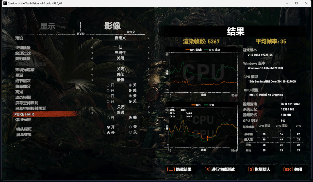 ▲《古墓丽影:暗影》,720P最低画质(35FPS)。从帧率曲线可看出,常规探索、剧情过场等场景能稳定维持在30FPS以上,操作响应基本跟手,可实现 “轻度流畅游玩”;但遇到复杂场景(如多植被的野外区域、动态光影密集的关卡)时,帧率会波动。