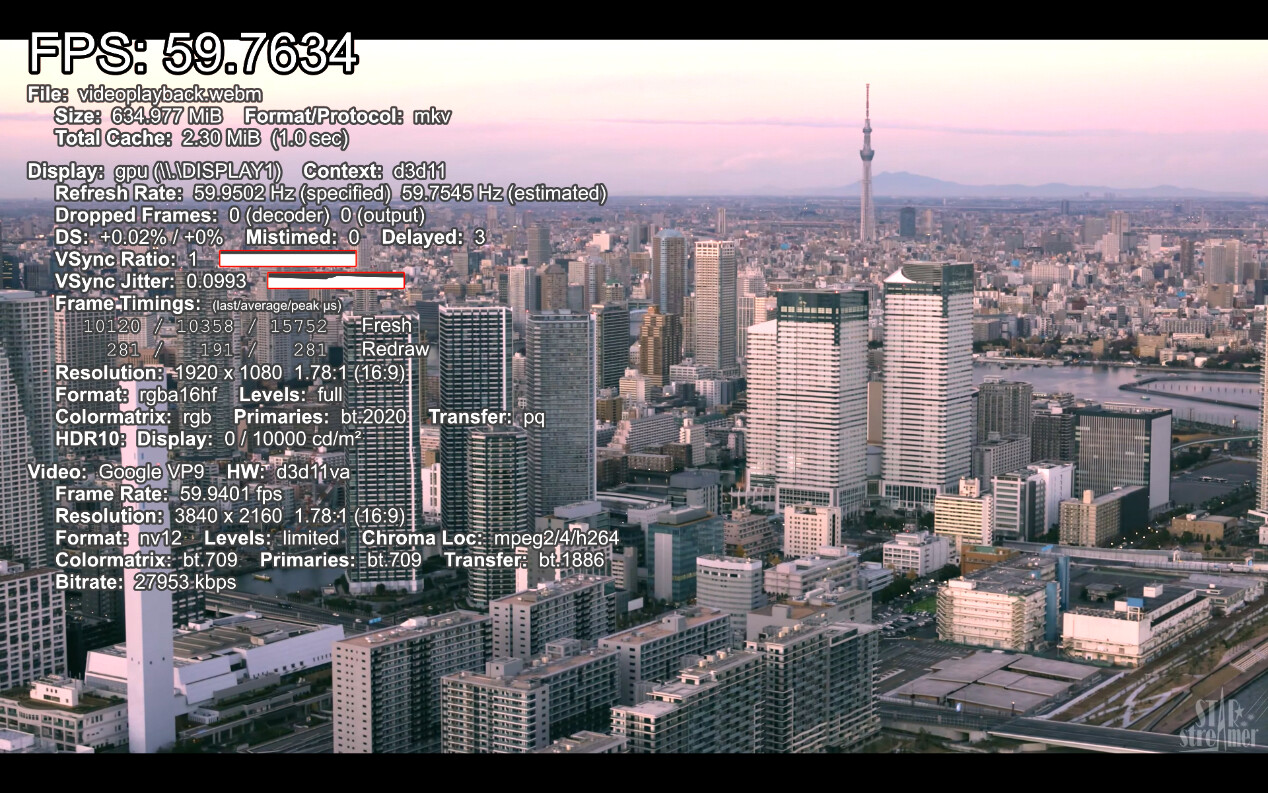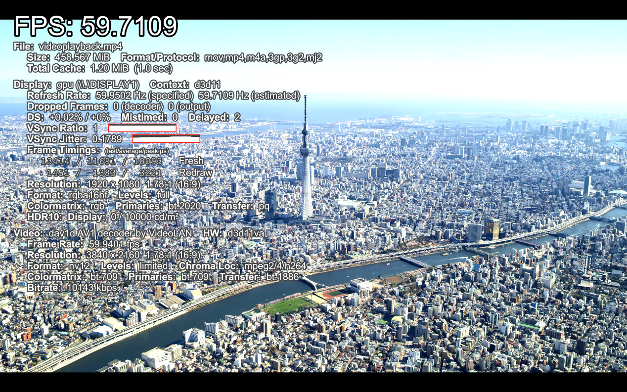 ▲AV1编码8k 60fps视频播放测试,播放流畅,帧率59.9FPS。