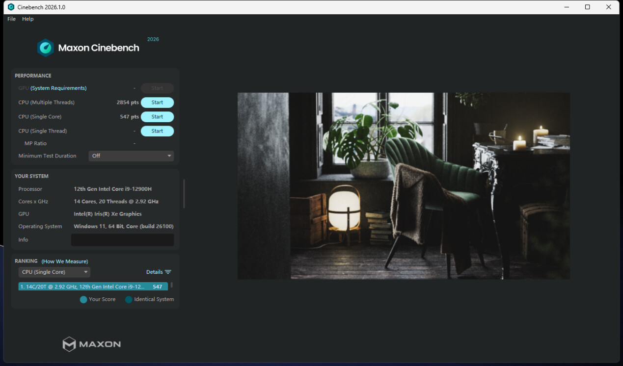 ▲CINEBENCH 2024测试,单核心分数为547pts,多核心分数为2854pts。