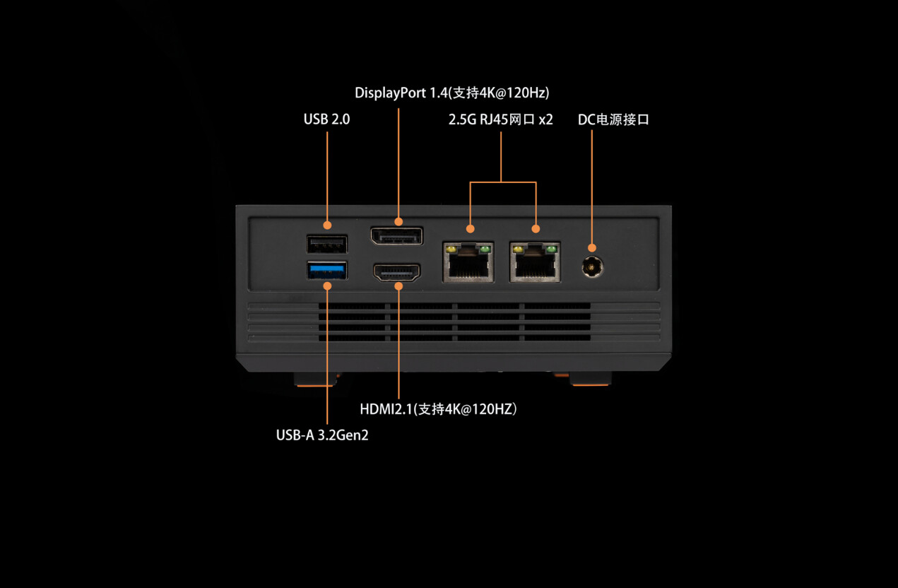 ▲AM03正面的创意可开合面板。它采用磁吸结构设计,单手即可轻松开启,闭合时则完全隐藏前置接口,形成视觉统一的一体式外观,完美平衡了美学与实用性。打开面板后,内置的2个USB-A 3.2 Gen2接口、1个USB-C接口和3.5mm音频接口即刻解锁,日常连接U 盘、耳机、移动硬盘等常用设备无需绕到机身背面,使用效率大幅提升。 ▲AM03背部IO接口一览。 这套接口规格与布局,在Mini PC的紧凑空间内实现了全场景覆盖。