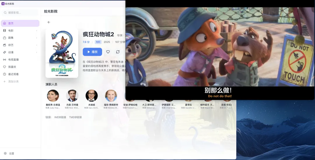 多格式影片支持:拾光影院兼容主流视频格式(如 MP4、AVI、MKV、MOV 等),并支持画质切换与画中画等,满足家庭观影的多样化需求。