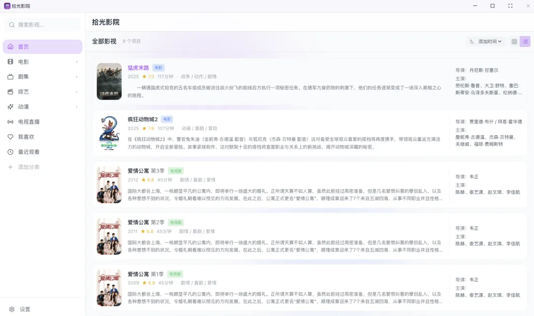 **轻量化转码服务:**拾光影视的后端转码服务具有体积更小占用硬件更低的特性,同样支持GPU加速,目前画质优化功能正在开发中,可以优化播放效果。