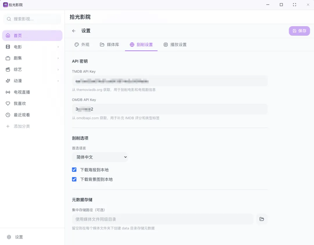 **全自动元数据刮削:**系统内置智能刮削引擎,可自动从 TMDB、IMDB 等权威影视数据库获取影片信息,包括高清海报、背景图、剧情简介、演员阵容、专业评分等完整数据。