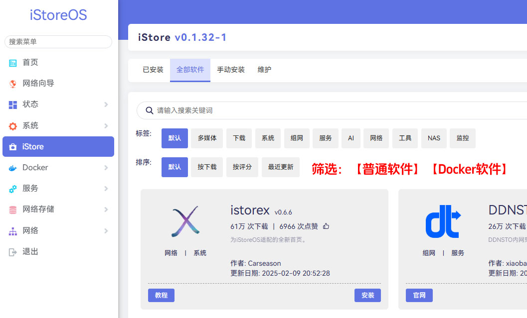 iStore里面有直接安装就能使用的软件和Docker软件两种。希望在页面上方增加筛选功能,如图所示: