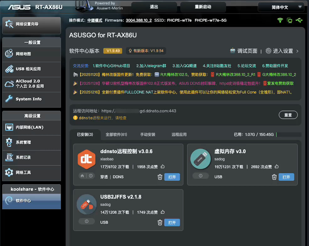华硕RT-AX86U 插件DDNSTO无法开机自启