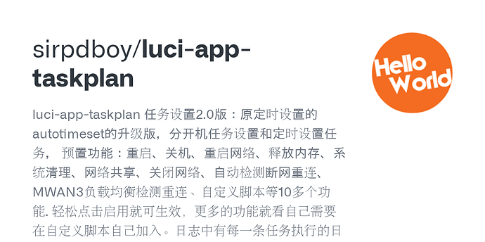 预置功能:重启、关机、重启网络、释放内存、系统清理、网络共享、关闭网络、自动检测断网重连、MWAN3负载均衡检测重连、自定义脚本等10多个功能. 轻松点击启用就可生效,更多的功能就看自己需要在自定义脚本自己加入。