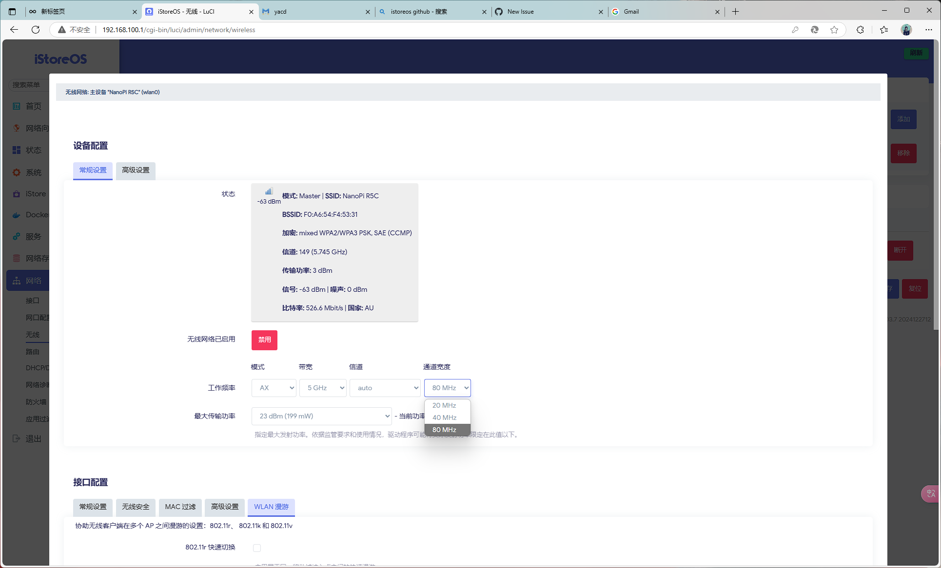 R5C iStoreOS 22.03.7 换上MT7922网卡,只支持80Mhz频宽