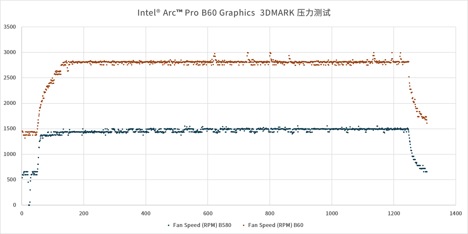 散热与噪音表现方面,满载状态下Arc Pro B60的涡轮风扇转速达到了2800RPM,此时的风扇噪音虽不至于达到“起飞”的程度,但也已经超出了普通家用场景的舒适范围;而Arc B580的双风扇在满载时仅维持在1500RPM左右,运行噪音极低,完全符合家用场景的静音需求。