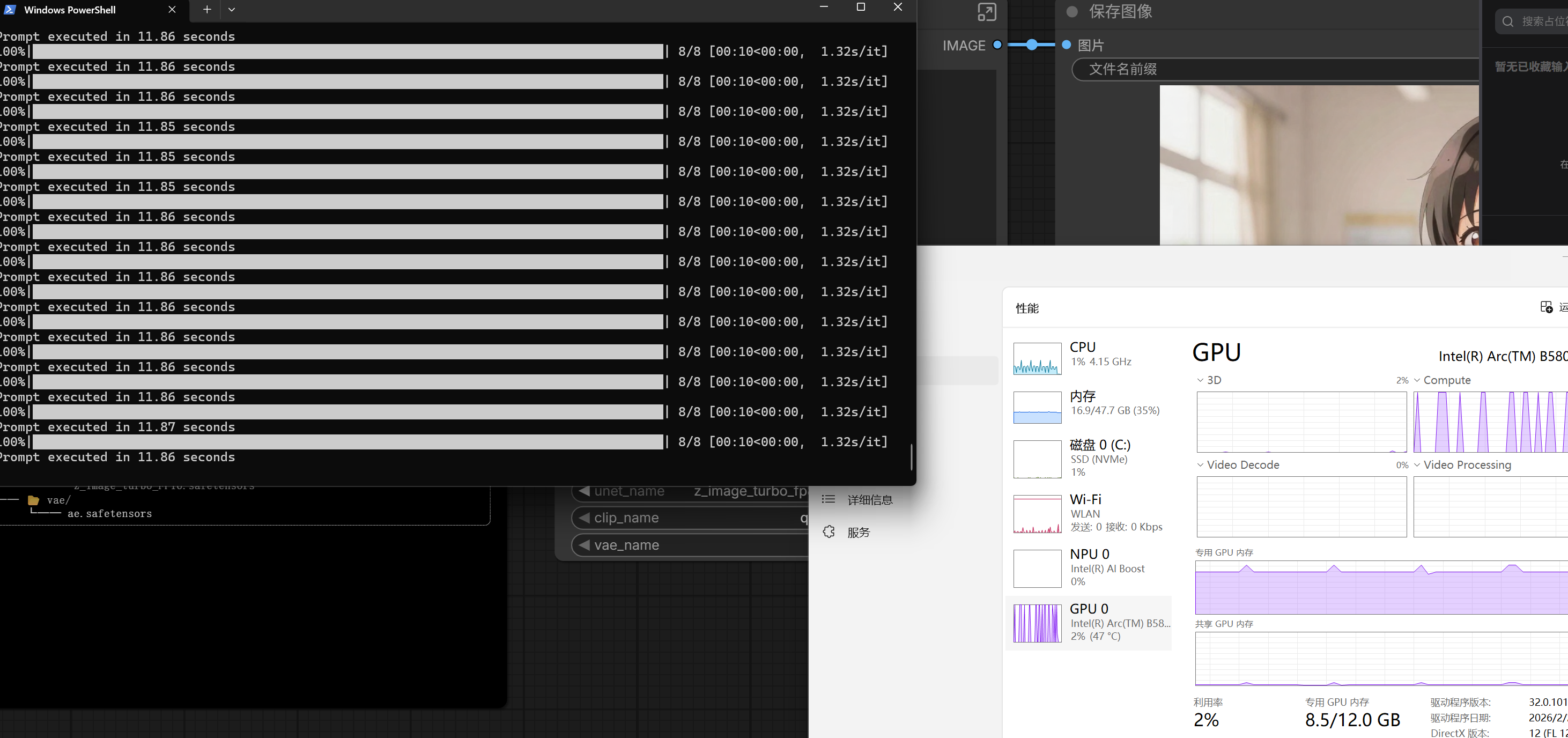 得益于24GB的超大显存,Arc Pro B60可以无压力运行Z-Image-Turbo精度最高的BF16全精度模型,测试中24GB显存基本被充分利用,连续生成100张二次元图片,平均单张耗时仅约10.9秒,且全程无卡顿、无崩溃,生成画面的细节与精度也拉满。