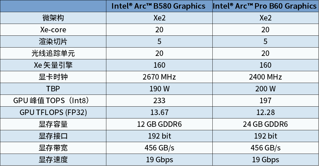 从Intel官方公布的技术参数来看,Arc Pro B60与Arc B580的核心GPU规格高度一致:两者均配备20个Xe-Core、160个Xe引擎、2560个渲染单元,核心算力底子完全相同;显存方面,Arc Pro B60的容量直接翻倍至24GB,不过显存位宽、运行速度与带宽均与Arc B580保持一致;功耗设定上,Arc Pro B60的TDP为200W,比Arc B580高出10W,但Arc B580的核心频率设定更高,因此峰值理论算力反而略占优势。