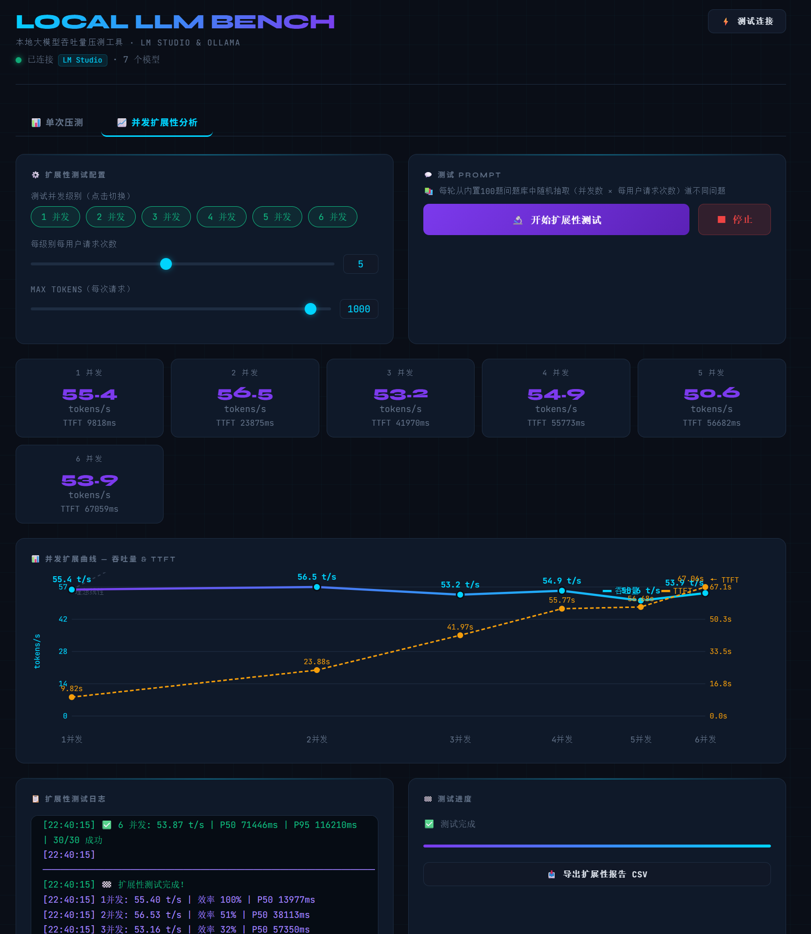 我们首先针对大语言模型本地推理性能进行了专项测试,测试平台选用Lm Studio,基于Vulcan API,覆盖DeepSeeK R1 7B、gpt-oss 20B、qwen3-vl-30b-a3b三种主流开源大模型,统一采用4bit量化,上下文长度设定为4096,通过自研测试工具,全面测试两款显卡在不同并发数下的推理速度、延迟表现与运行稳定性。