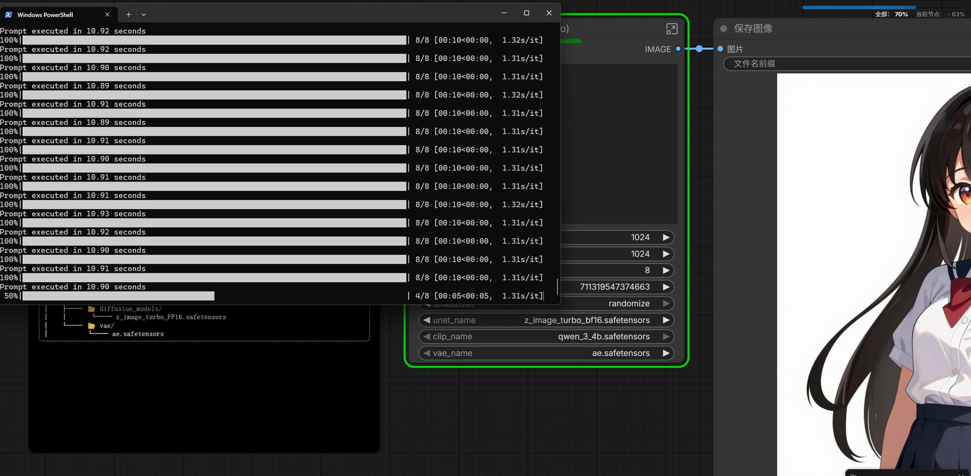 AI图像生成是另一大主流AI应用场景,我们采用ComfyUI平台,加载Z-Image-Turbo默认工作流,设定8步生成1024×1024分辨率图片,全面测试两款显卡的AI图像生成能力。